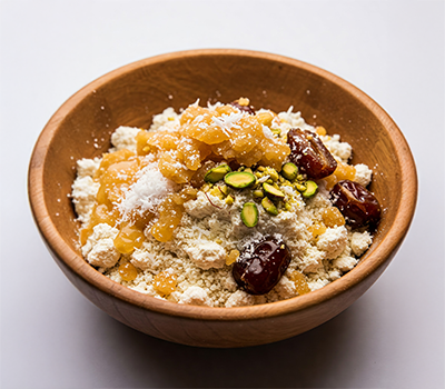 1. In a bowl, mix khapli flour with melted jaggery, grated coconut, dry fruits, and a pinch of salt. The mixture should be semi-dry but hold together if pressed. Add a little warm water if needed.
