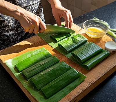 2. Cut banana leaves into rectangular pieces, pass them over a flame for a few seconds to soften, and grease lightly with ghee.