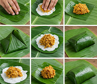 3. Place a portion of the mixture in the center of each leaf, fold into a triangle or a roll, and seal by tying with thread or folding the ends tightly.