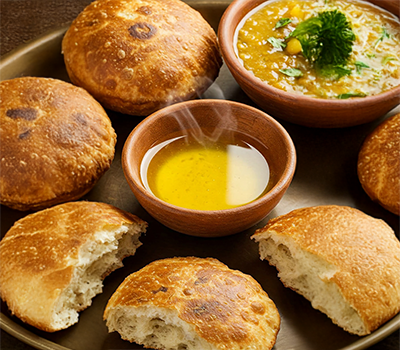 4. Break open hot baatis, dip them into a bowl of melted ghee. Serve with the hot dal on the side, garnished with coriander.