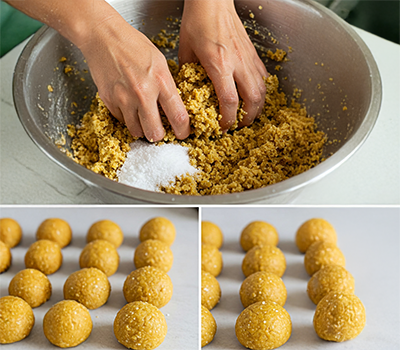 1. Mix Khapli atta with salt, a pinch of soda, and ghee. Add water slowly and knead into a firm dough. Shape into lemon-sized balls.