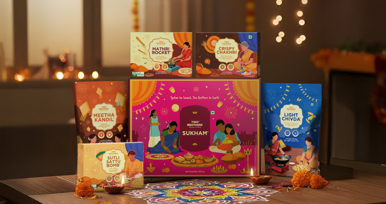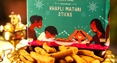 Take Two Brothers Organic Farms, which has beautiful artwork and storytelling on its Diwali boxes. Not only do the product names have Diwali allusions — such as Rangoli Barfi, Mathri rocket and Kaju Diyas — but the visuals play them up too.