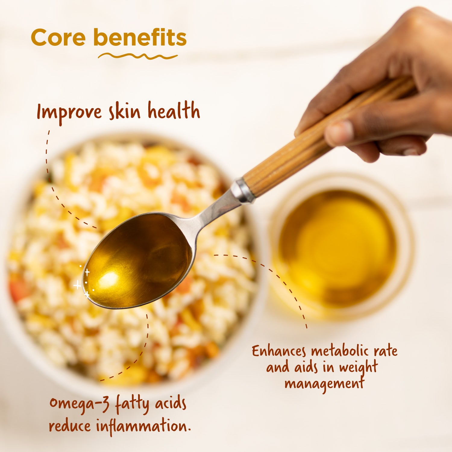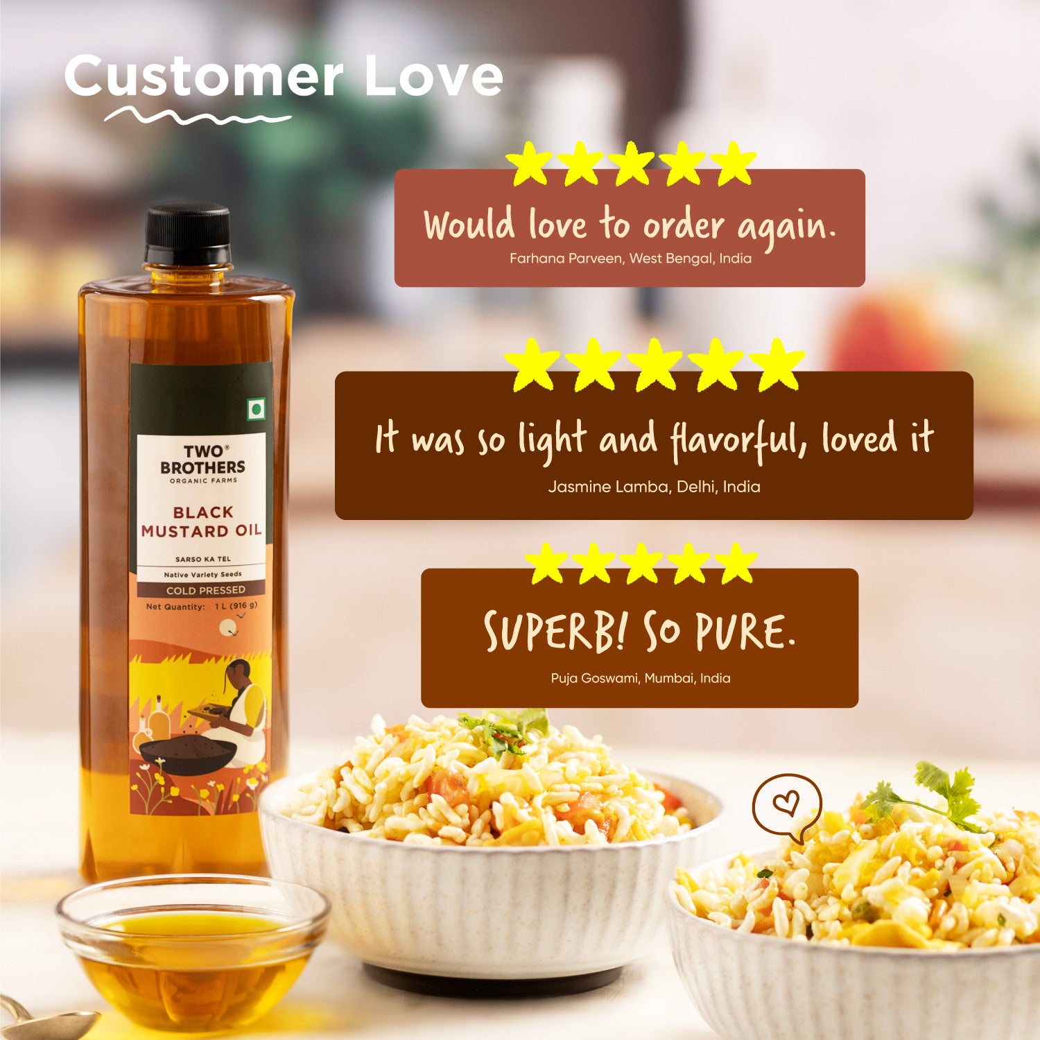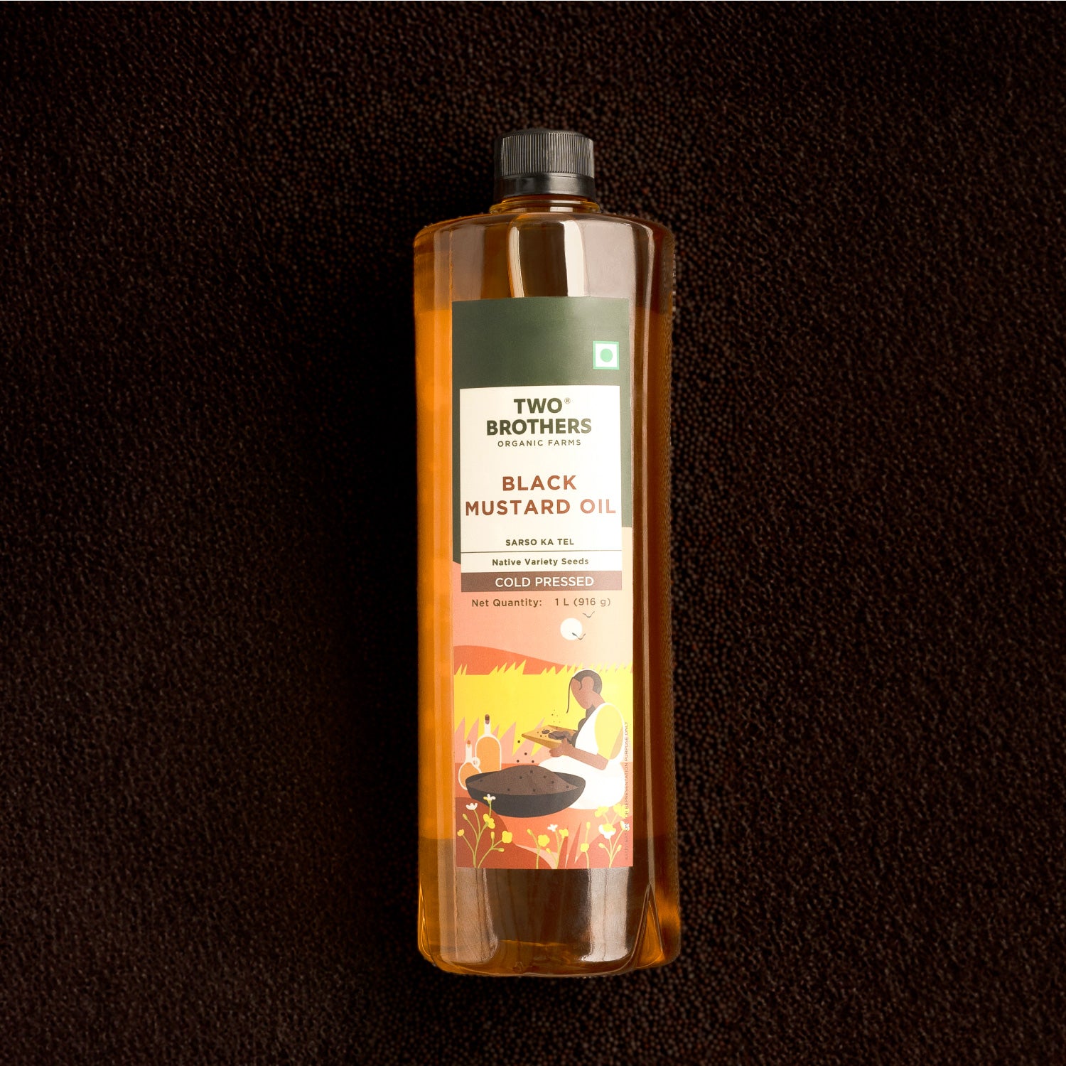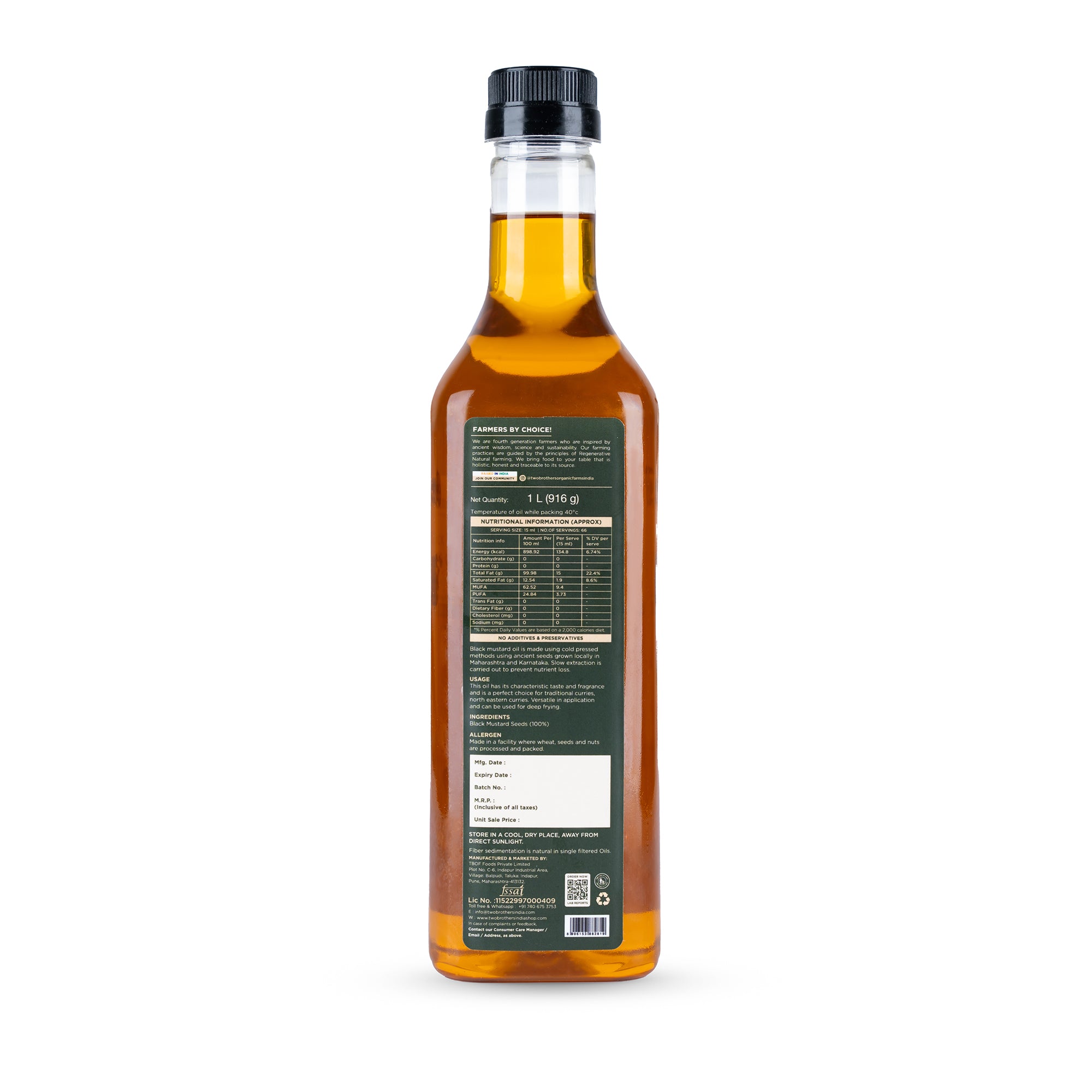Cold Pressed Black Mustard Oil (Kachhi Ghani or Mara Chekku) Oil made using Black mustard seeds grown locally in Maharashtra and Karnataka. Slow extraction is carried out to prevent nutrient loss.