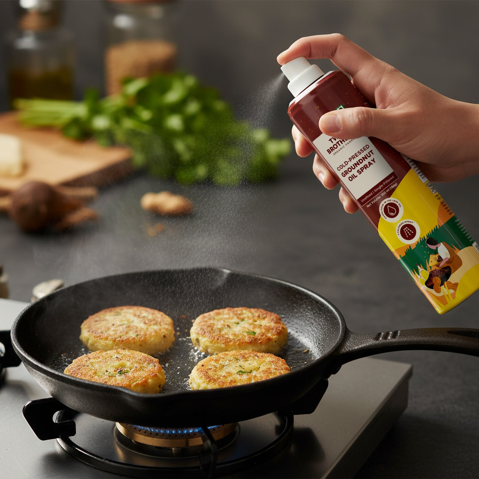Our Cold-Pressed Groundnut Oil Spray is the perfect balance of taste and convenience. Gives 4 cal / spray