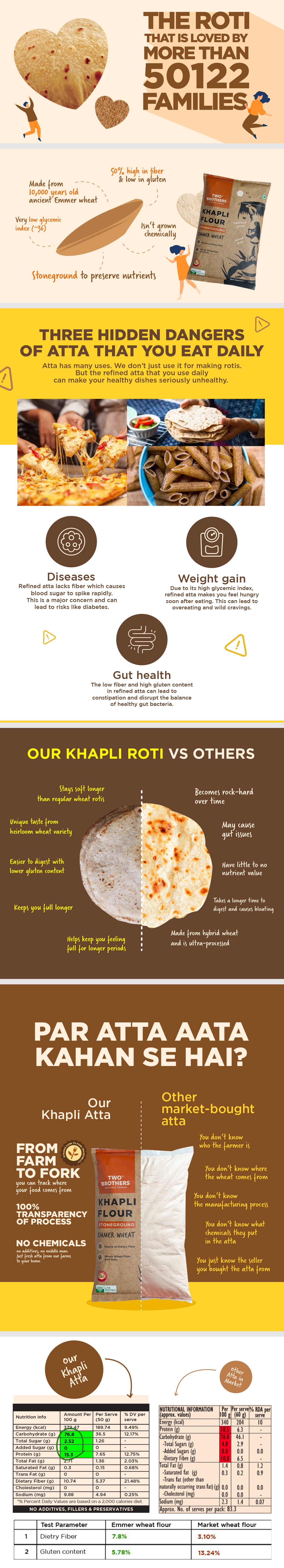 Crafted with care, our Khapli Wheat Flour is an authentic taste of tradition. Milled from ancient Emmer wheat grains, this flour holds 50% more fiber (than commercially available flour), is lab-tested, GMO-free, and is all about nutri-rich natural goodness.