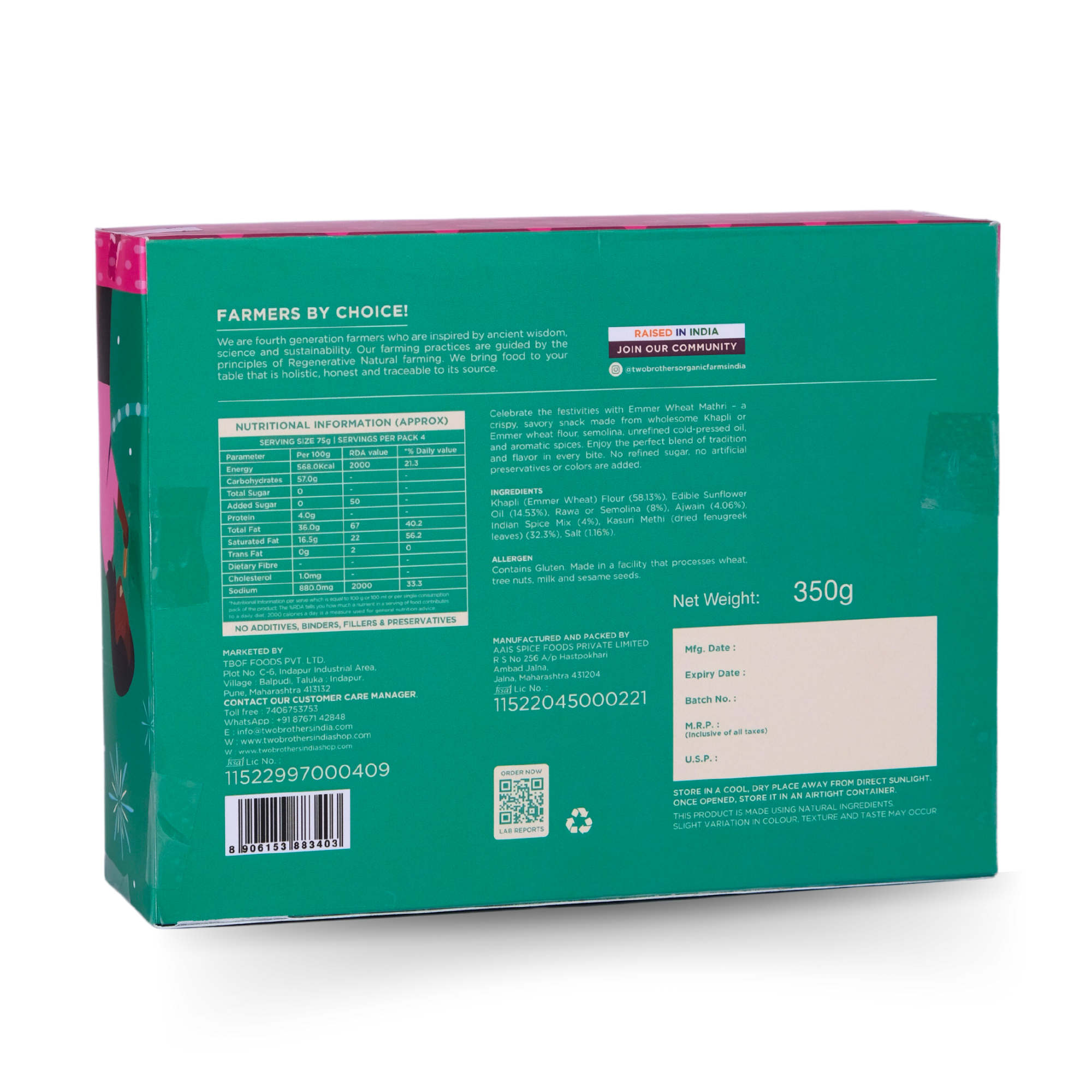 Celebrate the festivities with Emmer Wheat Mathri β a crispy, savory snack made from wholesome Khapli or Emmer wheat flour, semolina, unrefined cold-pressed oil, and aromatic spices. Enjoy the perfect blend of tradition and flavor in every bite. No refined sugar, no artificial preservatives or colors are added.