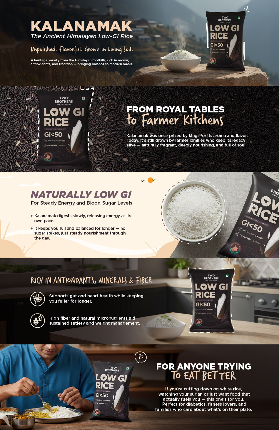 Kalanamak rice is a heritage variety grown in the Himalayan foothills, prized for its rich aroma, earthy flavor, and nutritional benefits. Naturally fragrant and unpolished, this ancient grain brings a wholesome, flavorful touch to your everyday meals.